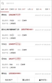 客戶狀態(tài)跟蹤: 置業(yè)顧問(wèn)通過(guò)微信端或登錄電腦端記錄每次聯(lián)系客戶的跟蹤記錄,如來(lái)電、去電、客戶到訪等,對(duì)成交的客戶進(jìn)行標(biāo)記。原始推薦人即可收到推送的消息,可以進(jìn)行傭金結(jié)算。