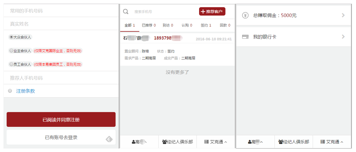 客戶注冊(cè):擁有微信并關(guān)注公眾號(hào),即可注冊(cè)申請(qǐng)成為全民營(yíng)銷系統(tǒng)的用戶(全民經(jīng)紀(jì)人)。注冊(cè)用戶可隨時(shí)通過(guò)微信查看已經(jīng)推薦的客戶信息、購(gòu)房進(jìn)度、傭金結(jié)算情況。